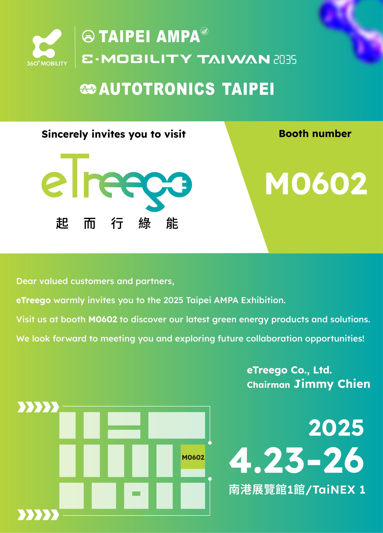 eTreego sincerely invites you to participate in the 2025 AMPA! From hardware components, automotive electronics, system solutions, to electric vehicles, self-driving cars and charging systems, this exhibition works with industry players to shape a full range of vehicle parts supply chain and new energy and smart mobility industry ecosystems.